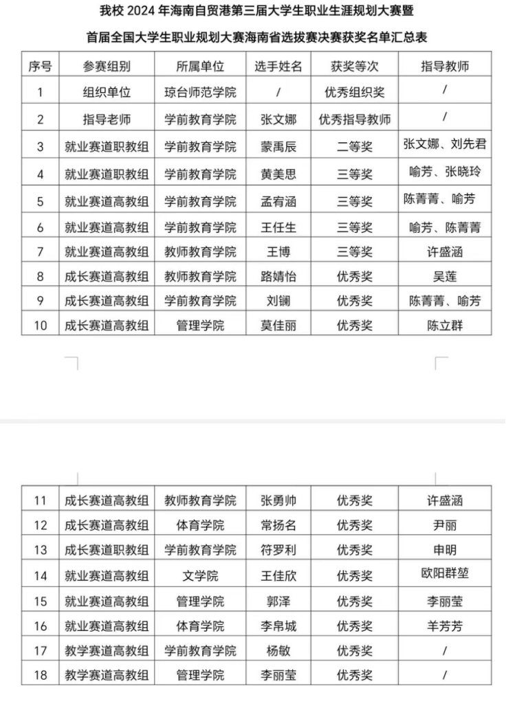 海南省人力资源和社会保障厅、省教育厅共同主办的海南自贸港第三届大学生职业生涯规划大赛暨首届全国大学生职业规划大赛海南省选拔赛现已圆满收官,本次大赛于2023年12月起启动,全省21所院校高校师生4.5余万学生参与赛事活动,大赛共设5个组别,按照分数排名共评选出决赛获奖166项,我校师生所获奖项18项,占比10.84%。其中,二等奖1项,三等奖4项,优秀奖11项;优秀指导教师1项;我校荣获优秀组织奖。