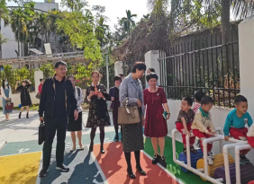 陈晖阳副书记一行8人认真查看了崖州中心幼儿园的户外环境,细致检查幼儿运动设施全面了了幼儿园办学条件,现场观看幼儿多项游戏活动,并亲切地和小朋友们进行了问候交流和游戏互动