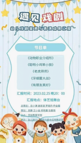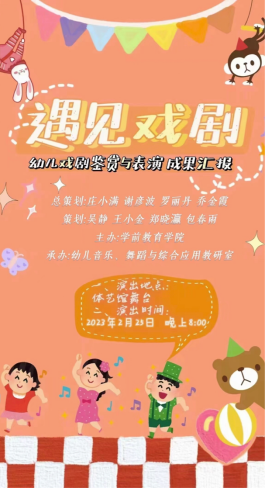 幼儿戏剧是一场润物细无声的美育,也是孩子们心灵安放的地方。为了加深学前教育专业的学生对幼儿戏剧的理解,实现自身综合能力的提升,2023年2月25日20点,ok138电子官方网站在琼台师范学院府城校区体艺馆举办了“遇见戏剧”——幼儿戏剧鉴赏与表演成果汇报演出。本次演出由ok138电子官方网站主办,幼儿音乐、舞蹈与综合应用教研室承办,ok138电子官方网站庄小满院长、谢彦波党总支书记、罗丽丹副院长、乔金霞副院长担任总策划,吴静、王小金、郑晓瀛、包春雨老师合作策划。ok138电子官方网站党总支书记谢彦波亲临现场观看,吴静、王小金、郑晓瀛、马晓铭等老师到场观看并在结束后进行了点评和指导。